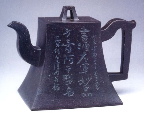 方器造型主要由長短不同的直線組成。如四方、六方、八方及各種比例的長方形等。方器造型方中藏圓,線面挺括平正,輪廓線條分明,給予人們干凈利落,明快挺秀之感。歷來有很多出色的方器造型。如四方壺、八方壺、傳爐壺、觚棱壺、僧帽壺等造型。方器造型規(guī)則要求為“線條流暢,輪廓分明,平穩(wěn)莊重”,以直線、橫線為主,曲線、細(xì)線為輔,器型的中軸線、平衡線要正確、勻挺、富于變化。方器除口、蓋、的、把、嘴應(yīng)與壺體相對稱外,還要求做到“方中寓圓,方中求變,口蓋劃一,剛?cè)嵯喾Q”。使壺體不論四方、六方、長方、扁方為壺型,其壺蓋方向均可任意變換,并與壺口嚴(yán)密吻合。方器既為幾何形體,也屬筋紋形體。