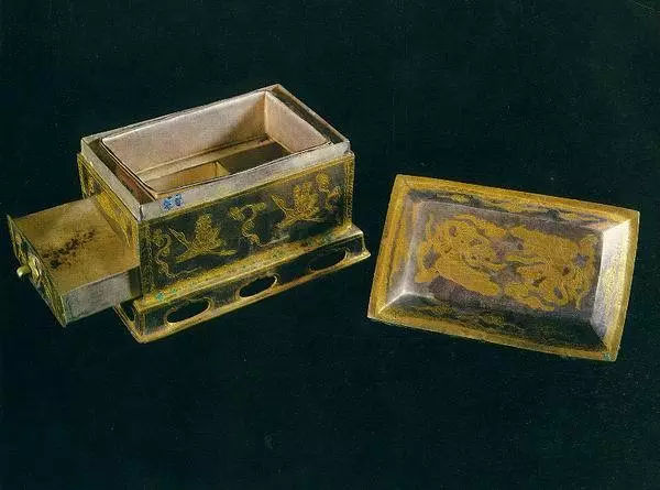 通高9.5厘米,羅身長13.4厘米,寬8.4厘米。屜長12.7厘米,寬7.5厘米,高2.0厘米。座長14.9厘米,寬8.9厘米,高2.0厘米,全重1472克。通體呈長方形,由蓋、羅、屜、羅架、器座組成,均系鈑金成型,紋飾涂金。蓋頂鏨兩體首尾相對的飛天,并襯以流云。蓋剎四周各飾一和合云。羅架兩側(cè)飾執(zhí)幡駕鶴仙人,另兩側(cè)為相對飛翔的仙鶴,四周飾蓮瓣紋。羅和屜均為匣狀,中夾羅網(wǎng),屜面飾流云紋,有拉手。羅架下有臺形座器,設(shè)鏤空壺門。