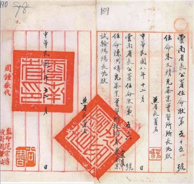 1919年12月,云南省長(zhǎng)公署任命朱文精為茶業(yè)實(shí)習(xí)所所長(zhǎng)的委任狀
