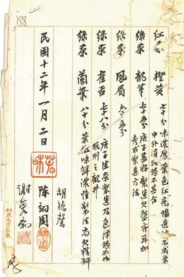 1922年11月,朱文精將實(shí)習(xí)所焙制的5種茶樣交實(shí)業(yè)司,轉(zhuǎn)送上??偵虝?huì)延請(qǐng)專家評(píng)定。擔(dān)任上??偵虝?huì)展覽會(huì)茶葉審查員的胡德馨、陳翊周、謝蓉齋3位茶業(yè)專家在詳細(xì)查驗(yàn)品評(píng)茶樣后,聯(lián)合出具了報(bào)告書。報(bào)告書記載,5份茶樣,合紅茶1份,綠茶4份,分別是橙黃、龍華、鳳眉、雀舌、蘭葉。其中蘭葉“葉嫩味鮮濃”得分最高,獲得80分。總體來看,專家們認(rèn)為茶業(yè)實(shí)習(xí)所送評(píng)的茶葉,無論紅茶還是綠茶,茶葉的底子都好,但制法上尚欠精研,還需提高。