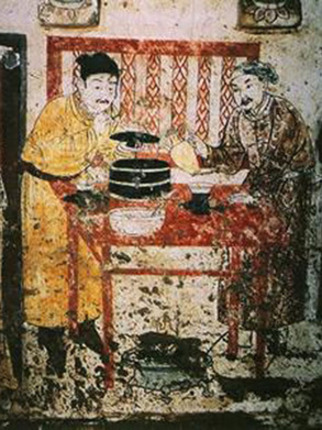 見于河北宣化下八里村6號墓遼代壁畫。壁畫中共有6人,一人碾茶,一人煮水,一人點茶,反映了當(dāng)時的煮茶情景。