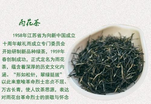 南京雨花茶是綠茶炒青中的珍品,也是中國三針之一,即:安化松針(半烘半炒),南京雨花(炒青),恩施玉露(蒸青),是優(yōu)質(zhì)細(xì)嫩針狀春茶,產(chǎn)于南京中山陵,雨花臺園林風(fēng)景區(qū),因此得名“雨花茶”。 雨花茶創(chuàng)制于1958年,是60年底代我國綠茶中嶄露頭角的新品名茶。