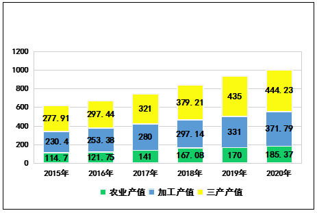 圖5  2015-2020年云南省茶產(chǎn)業(yè)結(jié)構(gòu)趨勢(shì)圖(億元)
