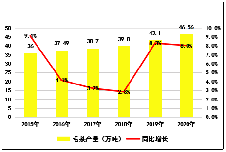圖2  2015-2020年云南省毛茶產(chǎn)量趨勢(shì)圖