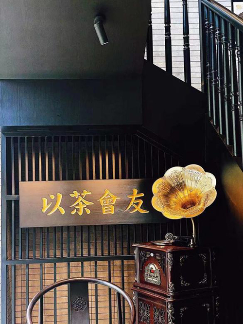 以茶會友的金字招牌上書“以茶會友”招徠過往賓客,配上傳統(tǒng)八仙桌與復古留聲機。在這個空間中喜茶靈感與廣式茶樓印象交融,傳統(tǒng)元素在打散重組中收獲新意。