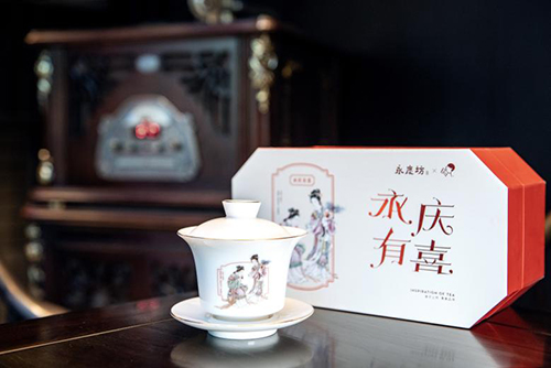「永慶有喜蓋碗杯禮盒」寓意天地人和,杯身印有翟惠玲老師的侍女品茗之圖,但手中替換為喜茶,別有一番玩味。